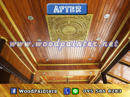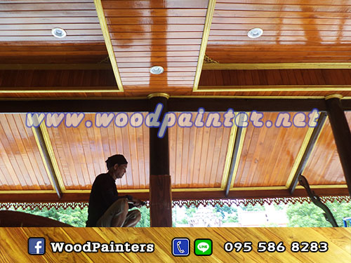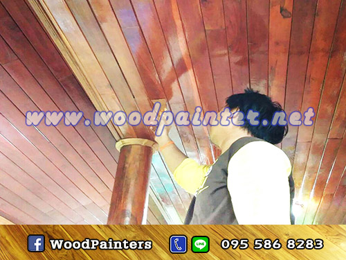 Wood Painter มีความยินดีที่จะให้บริการ งานทำสีฝ้าเพดานไม้จริง การทำสีฝ้าเพดานไม้จริงนั้นมีความยากในการทำ เพราะเป็นงานที่สูง ต้องแหงนหน้าขัดฝ้าเพดานไม้ และแหงนหน้าทาสี ความลำบากในทาสีฝ้าเพดานไม้นี้จึงใช้เวลาที่ทำค่อนข้างช้ากว่างานทำสีอื่น